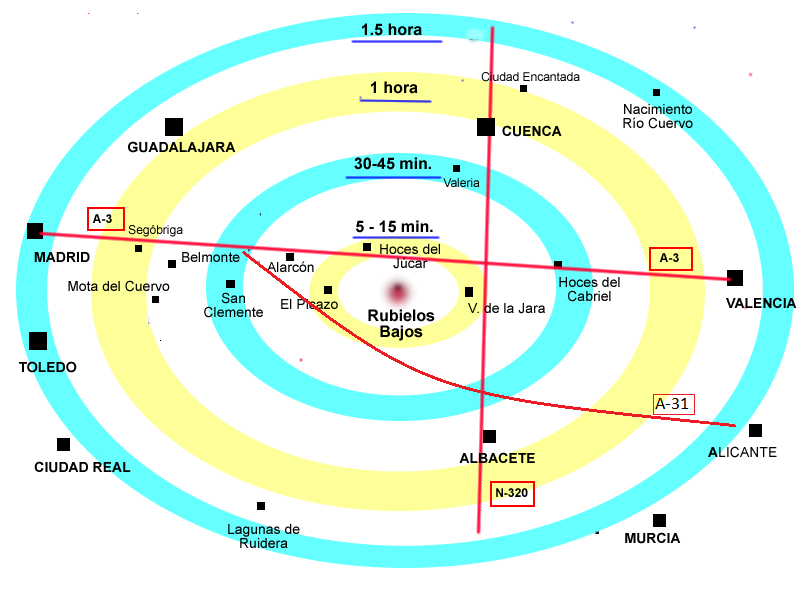 La casa rural está en la provincia de Cuenca, próxima a las localidades de Rubielos Bajos y El Picazo, aunque se encuentra en término de Villanueva de la Jara. A menos de una hora de Cuenca capital y Albacete. Y a menos de una hora y media de Valencia, Madrid ó Toledo.